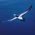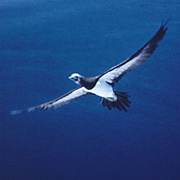 Boobies and gannets are large seabirds with long, heavy, pointed wings and long tails. Most have light-colored underparts and darker upperparts. Many members of this group are white. They are strong flyers, alternating between powerful wing beats and long glides. Most are sociable, nesting in colonies and foraging in flocks. They eat fish, squid, and other aquatic creatures, which they catch with spectacular plunge-dives. Their eyes are set forward on their heads, and this gives them binocular vision that aids them in foraging. When they plunge into the water, they use their wings to swim. They begin breeding at two to six years. Gannets and boobies are monogamous, and often form long-term pair bonds. Males bring nest material, and females build the nests. Both members of the pair help incubate the young by tucking one to three eggs under their webbed feet. Incubation lasts up to eight weeks, and the parents alternate in three-day shifts. Some species do not fledge until they are almost six months old, and are commonly dependent on both parents for up to nine months after that. Boobies are found in tropical waters, while gannets can be found in more temperate seas.