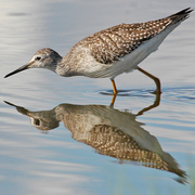 A mottled gray shorebird with bright yellow legs, the Lesser Yellowlegs is similar in appearance to the Greater Yellowlegs, with some important differences. The Lesser Yellowlegs is about half the size (in weight) of the Greater Yellowlegs, which is a useful distinction when the two are seen together. The bill of the Lesser Yellowlegs is not significantly longer than the diameter of its head, whereas the Greater Yellowlegs' bill is much longer. The bill of the Lesser Yellowlegs does not become paler at the base during the winter; it is solid black year round. Its bill always appears straight, without the slight upturn sometimes seen on the bill of the Greater Yellowlegs. In flight, the Lesser has a dark back, a white rump, and a dark tip on its tail. Relative to its size, the Lesser’s legs are longer than those of the Greater Yellowlegs, a difference that can be seen in flight (entire toes and tip of tarsus visible behind the tail). Juvenile Lesser Yellowlegs have finer streaking on their breasts than do juvenile Greater Yellowlegs.