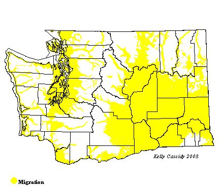 This species migrates through Washington on both its northward and southward trips, but is most common from mid-July through September. Most of the birds in Washington in July are adults, and the juveniles follow from late July into early October. Lesser Yellowlegs are fairly uncommon after the middle of October. They can be found along the coast and in a variety of wetland habitats throughout Washington's lowlands. In spring, they are uncommon migrants in eastern Washington from mid-April to mid-May, where they are found in freshwater wetlands.